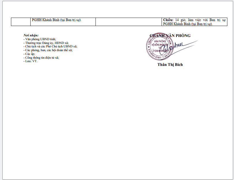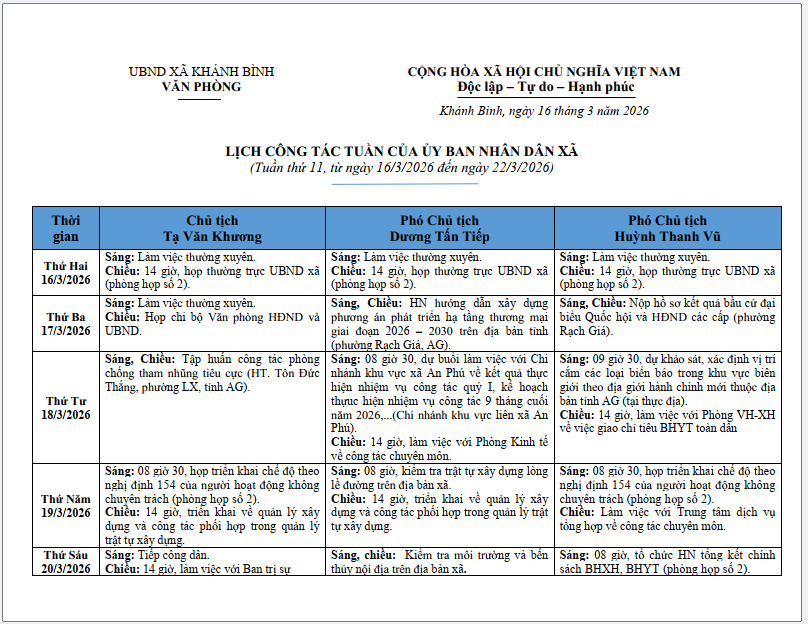 Lịch làm việc UBND xã Khánh Bình tuần 11