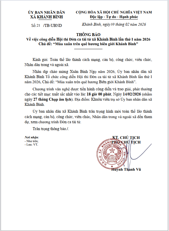 Thông báo về việc công diễn Hội thi Đờn ca tài tử xã Khánh Bình lần thứ I năm 2026 Chủ đề: “Mùa xuân trên quê hương biên giới Khánh Bình”